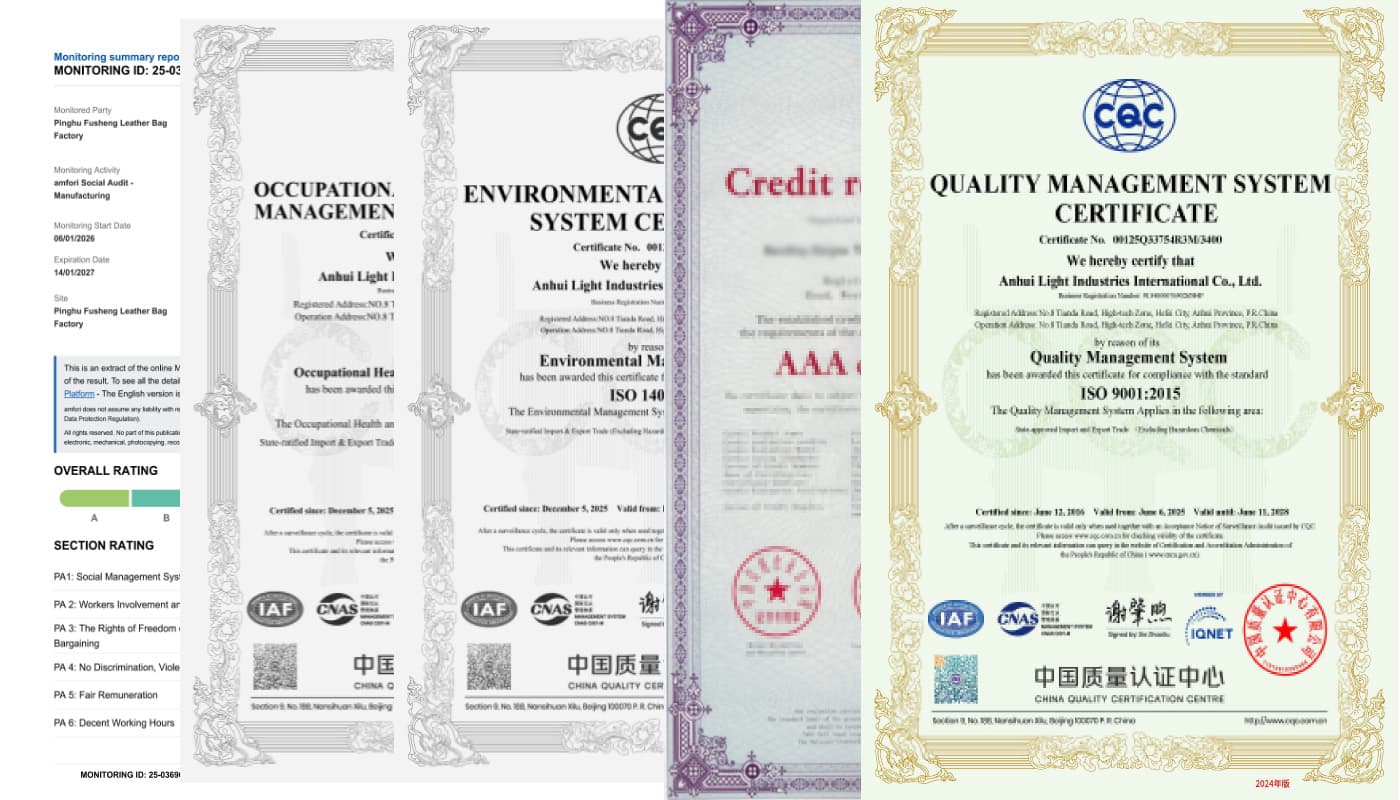 Our certified manufacturing system ensures consistent product quality, strict quality control, and continuous operational optimization. As a trusted supplier for global brands, we provide reliable OEM & ODM bag solutions that align with international sustainability requirements.